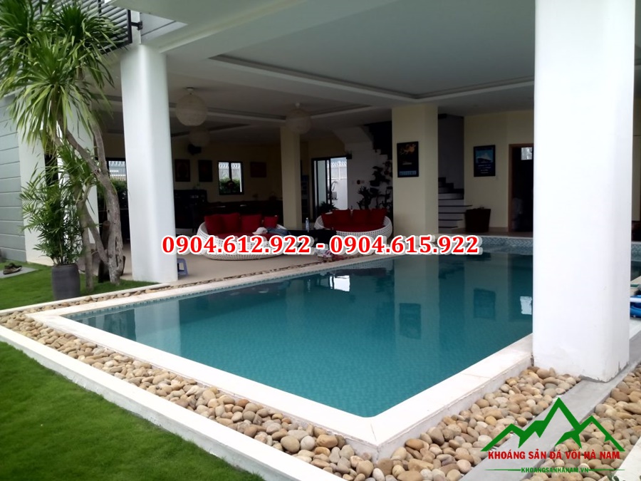 – Dùng sỏi làm viền hồ bơi: Xung quanh hồ bơi, các bạn có thể làm những đường rãnh nhỏ và rải sỏi lên, biến nó trở thành đường viền cho hồ bơi. Mang lại cảm giác gần gũi với thiên nhiên cho người sử dụng. Hiện nay, rất nhiều khách sạn, resort triển khai ý tưởng này để trang trí cho hồ bơi của mình.