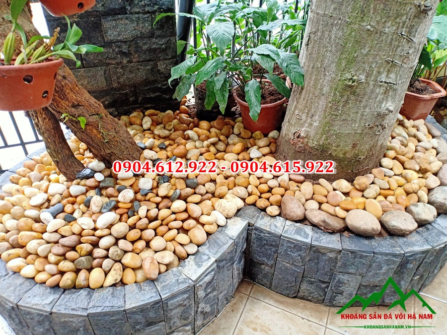 – Sỏi trang trí các chậu cây: Chúng ta có thể rải sỏi lên các chậu cây hoa, cây bonsai. Hoặc làm một lớp nền bằng sỏi rồi đặt chậu cây cảnh lên trên. Cách trang trí này rất đơn giản, dễ thực hiện nhưng mang lại hiệu ứng thẩm mỹ vô cùng bắt mắt đấy nhé.