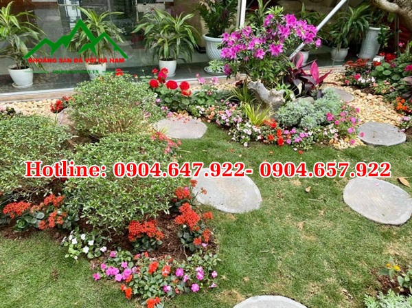 Tiểu cảnh chúng tôi thiết kế thi công bao gồm đá thớt cát kết khò mặt làm lối đi, sử dụng sỏi vàng tự nhiên, đèn đá kết hợp với cỏ Nhật và cây xanh tạo cảm giác gần gũi vô cùng.